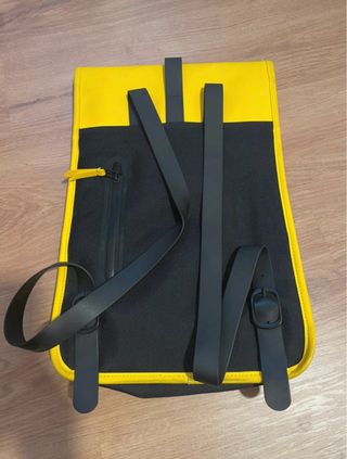 Mochila RAINS de color amarillo con detalles en negro. - Cierre con correa y mosquetón. - Base de la mochila en color negro. - Correas de hombro ajustables.