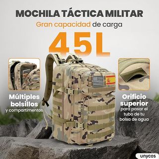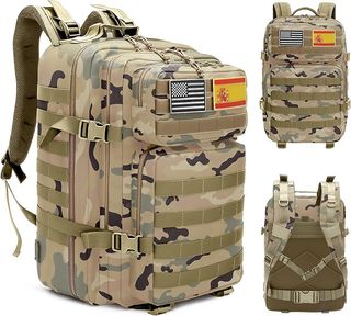 Mochila de estilo militar con gran capacidad, perfecta para actividades al aire libre o uso diario. - Diseño camuflado multicolor. - Capacidad de 45 litros. - Compartimento principal espacioso. - Múltiples bolsillos exteriores. - Correas de hombro ajustables y acolchadas. - Panel frontal con sistema MOLLE para accesorios.