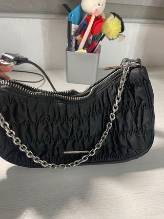 Bolso de hombro con un diseño acolchado y moderno. - Nunca lo he usado - Medidas: 30 x 30 cm - Acolchado con patrón de cuadrados. - Doble asa superior. - Cadena metálica de adorno. - Bolsillo exterior trasero con cremallera - En el interior tres bolsillos, uno de ellos con cremallera. - Bastante espacioso