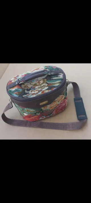 Neceser vintage con un bonito estampado floral y detalles en cuero - Diseño ovalado. - Asa superior. - Correa de hombro ajustable.