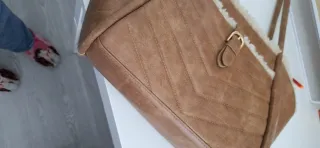 Bolso grande en tejido tipo acolchado color camel claro. Tiene cierre con cremallera y su interior se divide en dos apartados mas un bolsillo pequeño con cremallera. En su exterior tiene dos bolsillos con cremallera en una de sus caras. Tiene dos asas cortas y una larga regulable que se puede poner y quitar. Mide de ancho 34cm, de alto 31cm y de fondo 18cm. Esta en muy buen estado usado en tres ocasiones contadas.