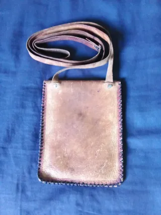 Bolso de hombro artesanal en cuero. - Diseño único con detalles grabados. - Cierre de botón. - Correa para llevar al hombro fija no ajustable . pequeño defecto en la junta de la correa en el cosido sin mayor importancia.