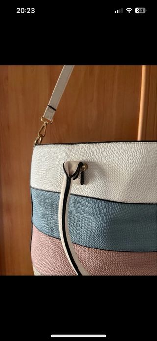 Bolso de mano con un diseño moderno y elegante Tiene una marca . - Combinación de colores en blanco, azul y rosa. - Material con textura. - Asas cómodas para llevar en la mano. - Correa ajustable para llevar al hombro.