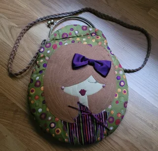 Bolso de mano con un diseño original de cara y detalles coloridos. Bolso unico - Asa trenzada para llevar al hombro. - Cierre de boquilla metálico. - Decoración con círculos de varios tamaños y colores.