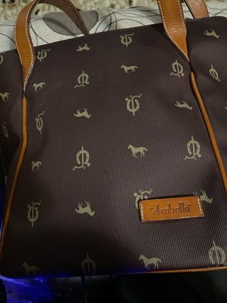 Elegante bolso de mano con un estampado distintivo de caballos y herraduras. Los detalles en piel le dan un toque sofisticado con un bolsillo interno. - Estampado de caballos y herraduras. - Ribetes y asas de piel. - Cierre de cremallera.