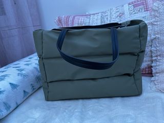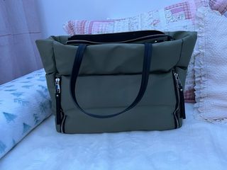 Bolso de estilo acolchado en un tono verde oliva. Cuenta con asas negras y detalles de cremalleras. - Diseño acolchado. - Cierre principal con cremallera. - Bolsillos laterales con cremallera.