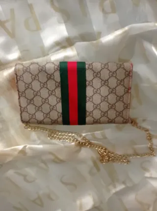 Elegante bolso con cadena para colgar. - Diseño icónico de la marca. - Acabado en color marrón. - Cadena dorada para llevar al hombro o cruzado. Medidas: 25 x 15. Incluye dos compartimentos y bolsillo central con cremallera, además de diversos bolsillos para tarjetas. IDEAL PARA REGALO.....o AUTORREGALO