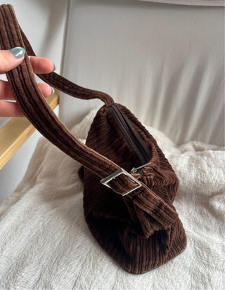 Bolso pana canalé marrón. Vintage y2k 2000. Cierre con cremallera, se puede regular el largo del asa con la hebilla. Tiene un bolsillo interior.
