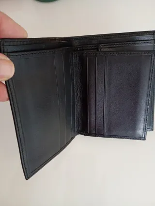 Elegante cartera billetera para hombre. - Fabricada en cuero. - Diseño vertical. - Múltiples compartimentos para tarjetas y billetes. - Incluye tarjetero extraíble. Nueva, sin uso, con pérdida de estrellas en la tapa, al natural no se aprecia prácticamente.