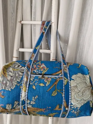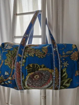 Bolso Macuto de asas hombro 100% Algodón acolchado. Color Azul, Azulón, Coral, Verde y Beige. - Confeccionado a mano Artesanal. Técnica Block Print. - Algodón de buena calidad. - Cierre con Cremallera para mayor seguridad. Tiene dos carruchas. - 2 Bolsillos: Tiene un bolsillo Exterior con cremallera y otro bolsillo interior. - Gran capacidad. - Es ideal para el fin de semana, viajes ó para el día a día, Muy funcional para todas las ocasiones. - Sólo se abrió para hacerle las fotos. Medidas: Alto 30 Cm. X Largo 45 Cm. Profundo 25 Cm. Asas 30 Cm. Antes el precio a 39€. Ahora por 26€