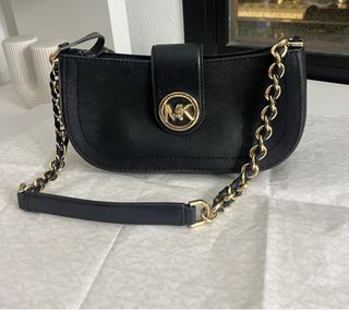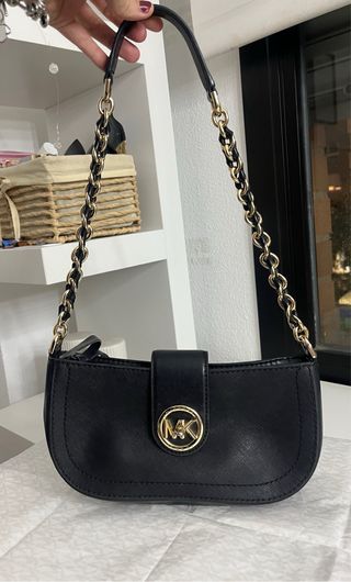 Elegante bolso de Michael Kors con detalles dorados. - Diseño curvo. - Cadena dorada. - Cierre de solapa con logo MK. El único defecto es que dentro del bolso en la tela tiene dos manchas, esta limpio pero no se van , por lo demás, el bolso perfecto. El precio voy a tener en cuenta su defecto. Es un bolso precioso y elegante.