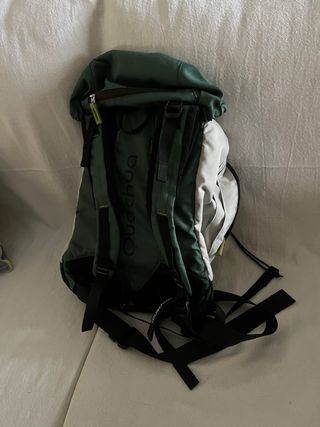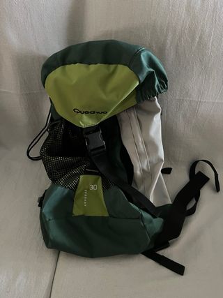 Mochila de senderismo Quechua Arpenaz con capacidad de 30 litros. - Color verde y verde oliva. - Compartimento principal con cierre de cordón y solapa. - Bolsillo frontal con cremallera. - Bolsillos laterales de malla. - Correas de hombro ajustables y acolchadas. - Espalda con acolchado para mayor comodidad.