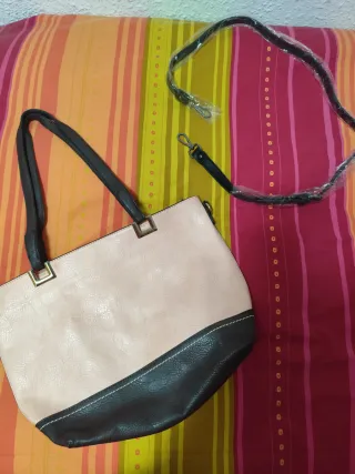 Bolso de polipiel con un diseño moderno y elegante. - Dos asas para llevar al hombro o en la mano. - Combinación de colores rosa palo y marrón. - Cierre superior. Y también, lleva asa larga para llevarlo cruzado.