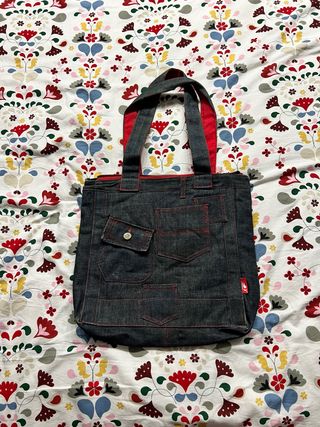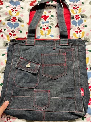Bolso de tela vaquera con un diseño moderno y práctico. - Material: tela vaquera. - Forro interior de color rojo. - Múltiples bolsillos exteriores.