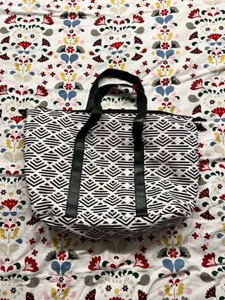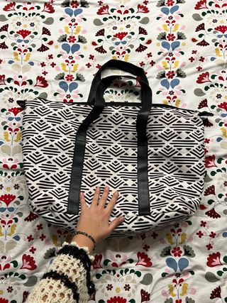 Bolso grande con un llamativo diseño geométrico en blanco y negro. Cuenta con asas de cuero negro para un transporte cómodo. - Diseño de rombos en blanco y negro. - Asas de cuero negro.