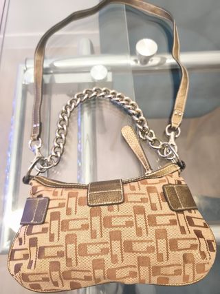 Bolso de mano con un diseño elegante y moderno. - Acabado en tela con monograma. - Cierre metálico con logo. - Asa de cadena y correa ajustable (se puede quitar) Muy bien estado, prácticamente sin usar.