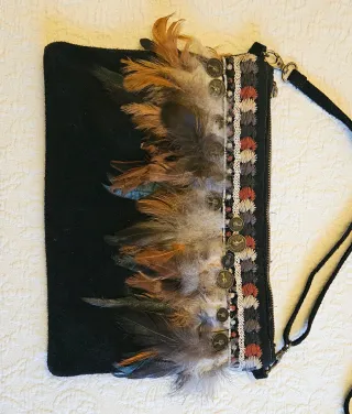 Bolso bandolera con un diseño bohemio y detalles únicos. - Adornado con plumas y abalorios. - Cremallera superior para cierre. - Correa ajustable para llevar al hombro. Tamaño: 30 cm x 22 cm