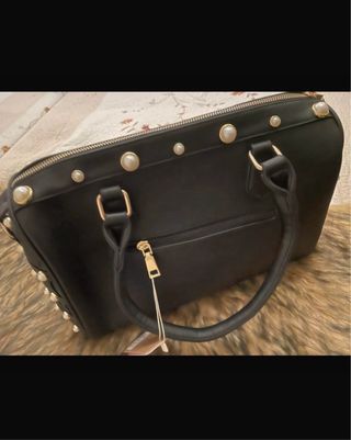 Elegante bolso de mano con un diseño único. - Decorado con perlas y tachuelas doradas. - Asa de mano y cierre de cremallera.