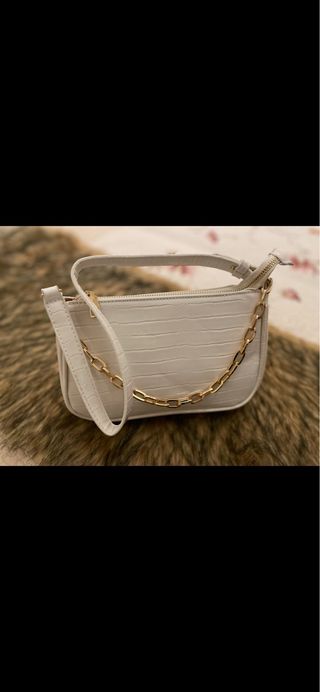 Bolso blanco con un diseño moderno y elegante, adornado con una cadena dorada. - Textura tipo piel de cocodrilo. - Asa corta. - Cierre de cremallera.