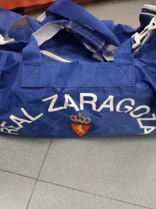 Práctica bolsa deportiva con el escudo y nombre del Real Zaragoza. - Diseño en color azul con detalles blancos. - Asas de mano y correa para hombro.