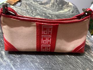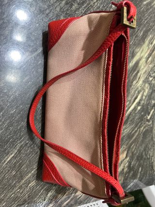 Elegante bolso de mano con detalles en piel. - Combinación de lona beige y piel roja. - Adorno central con logo. - Cierre de cremallera superior. - Asa corta para llevar en la mano o al hombro.