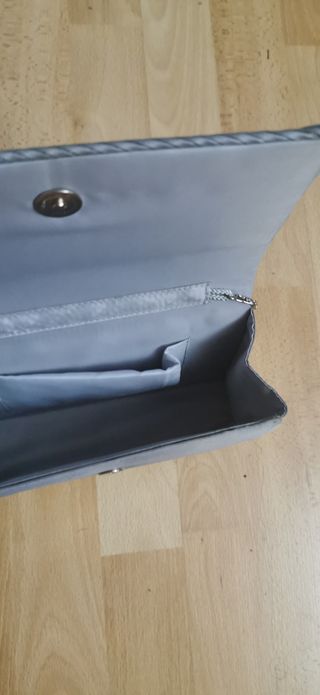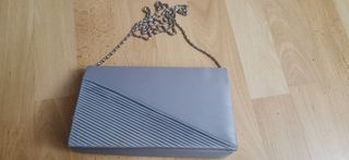 NO HAGO ENVIOS Elegante bolso de mano en color gris, perfecto para ocasiones especiales. Cuenta con una cadena metálica para llevarlo al hombro o cruzado, con algun enganche en los dobles de delante, ver foto - Diseño moderno con detalles texturizados. - Cierre de solapa.