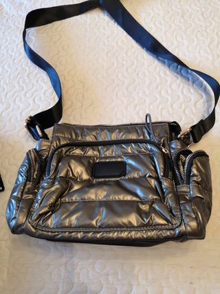 Bolso en perfecto estado. Color caqui metalizado e impermeable. No pesa nada, cómodo pero un poco pequeño para mi. Un solo uso. Tiene varios bolsillos, interiores y exteriores No hago envíos Sólo puedo entregar en portal de parque de Lisboa