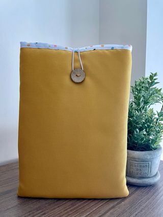 ⚠️SOLO HAGO ENVIOS⚠️ Funda de tela ideal para libros confeccionada a mano con tela impermeable de color mostaza y acolchado. Medidas: ✅Alto: 28cm; ✅Ancho: 21cm; ✅grosor máximo: 4,5cm LOS ELEMENTOS DECORATIVOS NO ESTÁN EN VENTA SOLO LA FUNDA