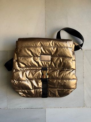 Mochila con acabado brillante y diseño acolchado. - Material impermeable. - Cierre con hebilla metálica. - Compartimento principal. - Correa ajustable.