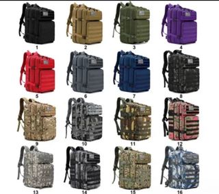 Set de dos mochilas tácticas de 50 litros, ideales para gym o actividades al aire libre. Son impermeables y cuentan con sistema Molle. - Color negro. - Color morado. OFERTA DE 2 MOCHILAS COLOR DISPONIBLE ALEATORIO CAMUFLAJE . CHOLLO OFERTA DISPONIBLE SE ENVIAN COLORES AL AZAR .