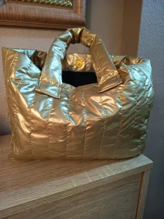 Bolso de mano con un acabado brillante y moderno. - Diseño acolchado con costuras verticales. - Asas cómodas para llevar al hombro o en la mano. - Material sintético con efecto metalizado e impermeable. -Cierre con Clic. #bolsodemano #bolsodediario #bolsodorado #bolsoderecados #bolsoimoermeable #wallapopespaña #wallapopitalia #wallapopportugal