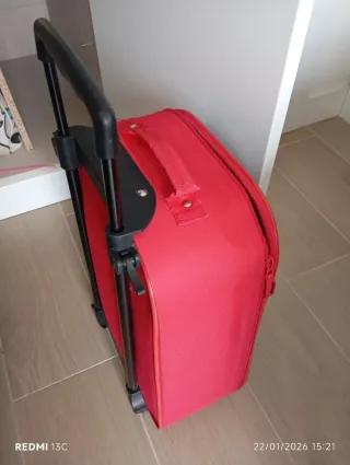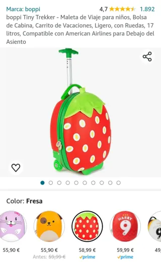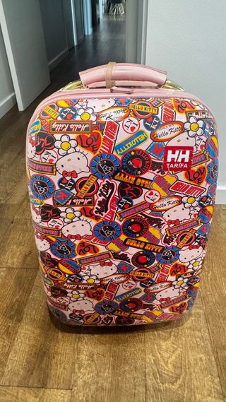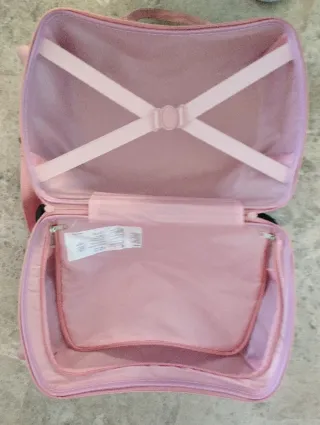 Trolley infantil con un divertido diseño de fresa y capacidad de 17 litros. Ideal para los más pequeños. Solo se ha usado 2 veces. Tiene unas pequeñas marcas donde apoya en el suelo (se ve en las fotos), por lo demás, la maleta está como nueva. - Diseño de fresa. - Capacidad de 17L.