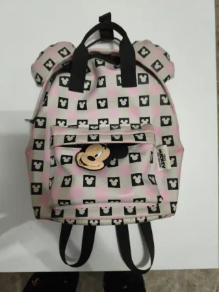 Adorable mochila infantil con diseño de Minnie Mouse. - Estampado a cuadros en rosa y beige. - Detalle de orejas en la parte superior. - Parche de Minnie en el bolsillo frontal.