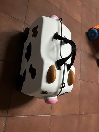 Maleta infantil con diseño de vaca, perfecta para que los más pequeños viajen cómodos y entretenidos. - Ruedas para facilitar el transporte. - Asa para llevarla como equipaje de mano. - Diseño divertido y original.