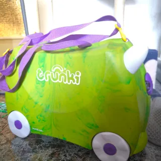 Maleta de viaje para niños de la marca Trunki. Diseñada para que los más pequeños puedan montar sobre ella y llevar sus pertenencias. - Ruedas resistentes para facilitar el desplazamiento. - Asa de mano para transportarla. - Cierre de seguridad.