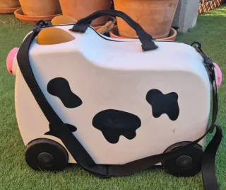 Maleta infantil con diseño de vaca, perfecta para los más pequeños. - Ruedas para facilitar el transporte. - Asa superior para llevarla cómodamente. Se puede subir el niño y llevarlo tirando de la correa.