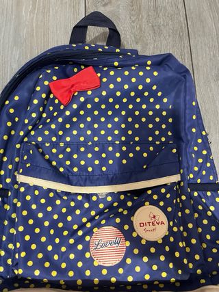 Mochila infantil con un divertido diseño de lunares. - Estampado de lunares amarillos sobre fondo azul. - Adorno de lazo rojo en la parte superior. - Parche con la inscripción Lovely y DITEYA Sweet!. - Bolsillos laterales. - Base reforzada.