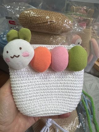 Adorable bolsito infantil tejido a mano, perfecto para los más pequeños. - Diseño con apliques de huevos de Pascua y un personaje. - Tejido blanco principal con detalles coloridos. - Ideal para llevar pequeños tesoros. Se vende en lote de 10 unidades, ideal para reventa. Sale a 2€ unidad. Colores surtidos.