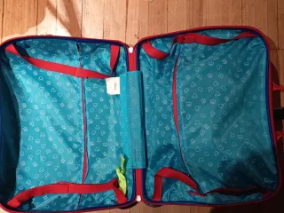 Maleta de viaje para niños con un divertido diseño. 50x33x14 cm - Tirador extensible y ruedas para facilitar su transporte. - Compartimento principal con cremallera. - Bolsillo frontal con cierre de velcro. - Varios bolsillos más lateral y trasero. Usada con marcas de su uso (ver últimas fotos) pero bastante bien conservada y totalmente funcional.