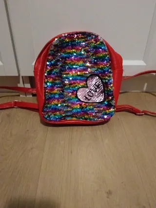 Mochila infantil con un diseño llamativo y divertido. - Parte frontal adornada con lentejuelas multicolores. - Corazón decorativo en lentejuelas plateadas. - Tirantes ajustables para mayor comodidad.