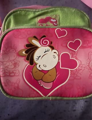 Adorable bolsito infantil de la marca Catina, con un diseño encantador. - Color principal: rosa con detalles en verde. - Estampado frontal con un tierno caballo y corazones. - Correa ajustable para llevar cruzado o al hombro. - El bolsito esta nuevo sin usar.