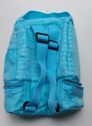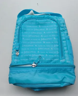 Mochila infantil de la marca Johnson's Baby en color azul. Presenta un diseño con el logo repetido. - Asa superior. - Cierre de cremallera principal. - Bolsillo frontal con cremallera.