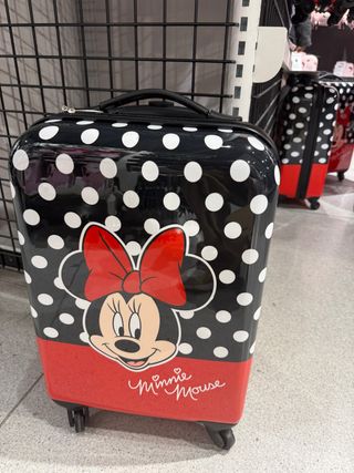 Maleta de cabina con el diseño de Minnie Mouse y lunares. - Diseño frontal de Minnie Mouse. - Patrón de lunares blancos sobre fondo negro. - Base y detalles en color rojo.