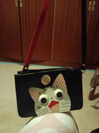 Bolso de hombro Infantil de gato. Está totalmente NUEVO, no se ha usado. Tiene 1 cremallera, que da lugar a otras 3 cremalleras. La cuerda al hombro de puede quitar si no se quiere.