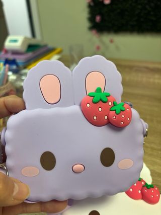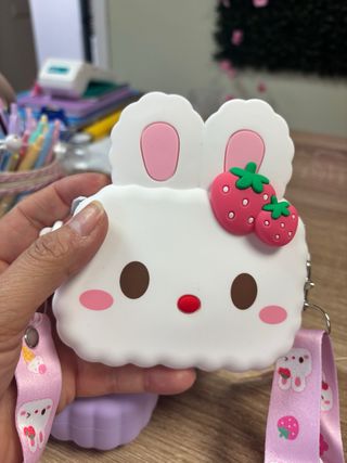 Adorable bolsito con diseño de conejo y detalles de fresas. - Orejas de conejo con interior rosa. - Dos fresas decorativas en la parte superior. - Ojos y mejillas rosadas. - Nariz roja. - Correa con estampado de dulces y fresas.