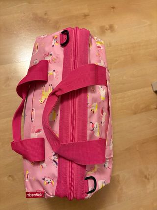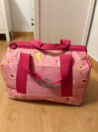 Práctica bolsa de viaje con un divertido estampado infantil. Comprada en verano 2025.Usada solo en un viaje. - Diseño con animales y ballena. - Asas de mano y cremallera superior. - Color principal rosa.