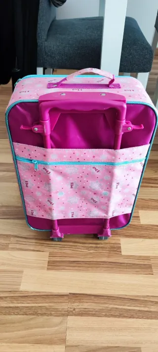 Maleta infantil con un diseño alegre y colorido. Perfecta para los más pequeños. - Asa extensible para facilitar su transporte. - Ruedas para moverla cómodamente. - Cierre de cordón. - Detalle de tetera en la solapa frontal.