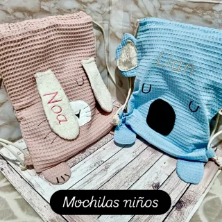 Preciosas mochila y bolsa de tela, ideales para llevar al parque, a la guarderia... La mochila mide 30x23cm, y la bolsita mide 20x18cm. Personalizables con el nombre y distintos estampados para elegir. Un bonito detalle para regalar, hecho a mano con cariño.