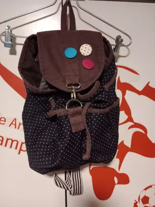 Mochila con un divertido estampado de lunares y detalles en marrón. - Diseño con solapa. - Tres botones decorativos en la solapa. - Cierre con clip metálico. - Bolsillos laterales.