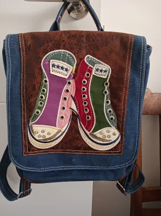 Mochila juvenil con un diseño original de zapatillas. - Material principal: tela vaquera. - Detalle frontal: apliques de zapatillas. - Cierre: solapa con botón a presión y cremallera. - Correas ajustables.